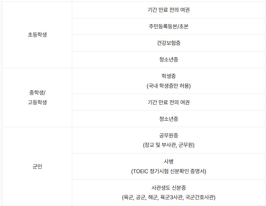 - 군인 할인 접수자는 시험 당일 군인 신분임을 증명할 수 있는