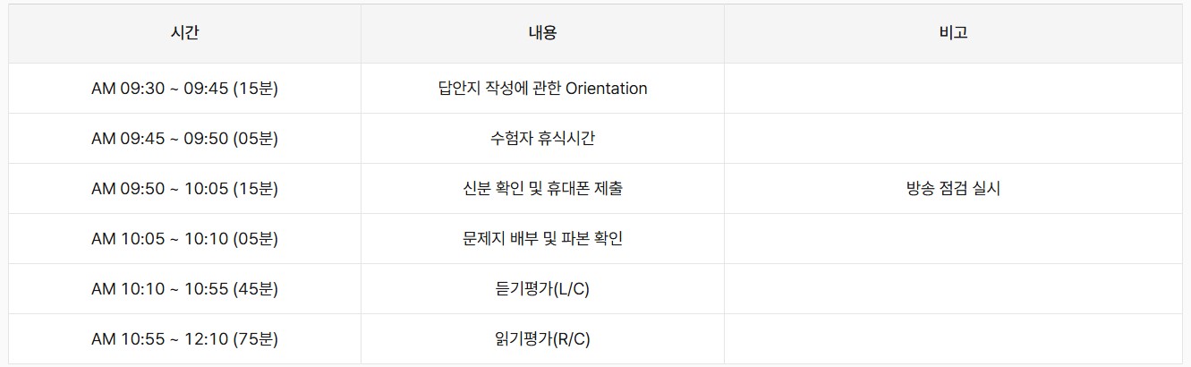 아래는 토익시험 시간표입니다.