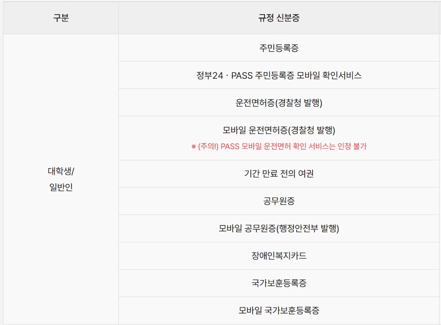 대학생/ 일반인의 경우 규정신분증이 없다면